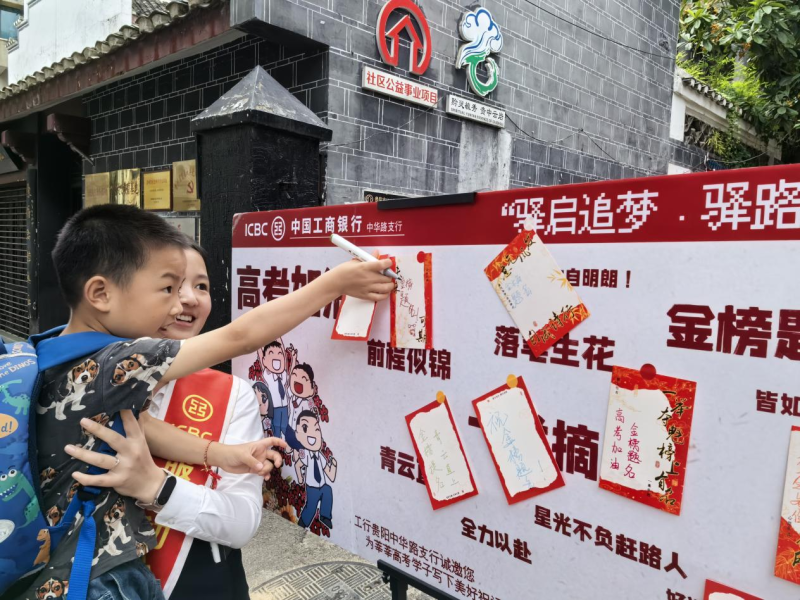 工行贵阳分行工作人员帮助路过的小朋友为莘莘学子送上祝福